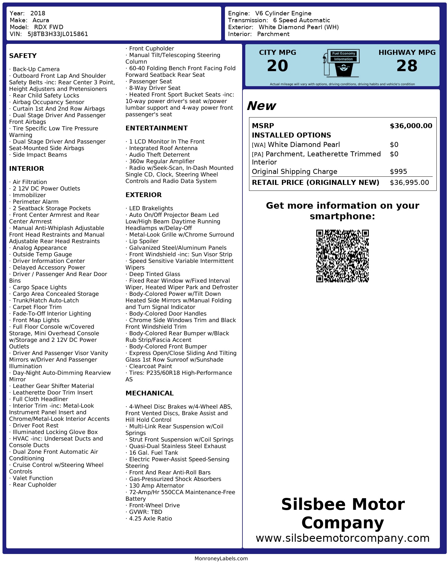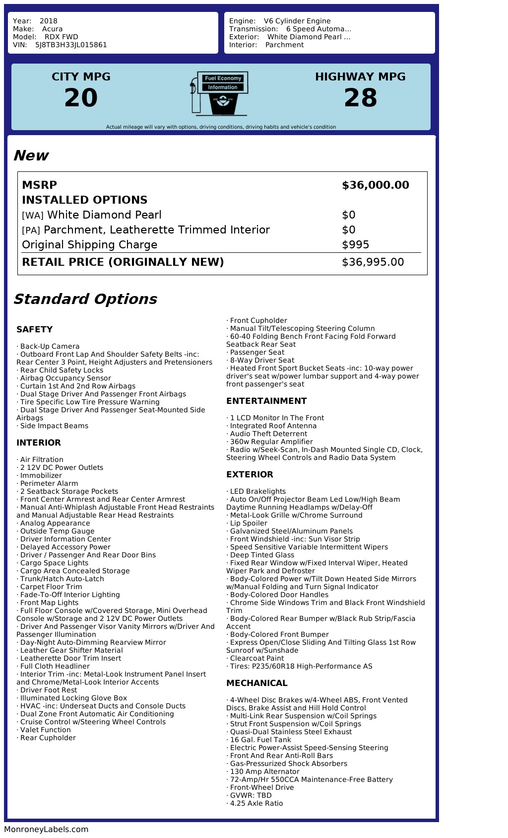 Step into luxury with this sleek and sporty White 2018 Acura RDX! Packed with power, this car features a 3.5L SOHC V6 engine paired with a smooth 6-speed automatic transmission, delivering a driving experience like no other. Cruise down the road with confidence on the front-wheel drive, while the gas-pressurized shock absorbers absorb any bumps along the way.With a stylish exterior that includes a sunroof, LED headlights, and chrome accents, this Acura RDX is sure to turn heads wherever you go. Slide into the heated front sport bucket seats and enjoy the ride in comfort, while the dual-zone air conditioning keeps the cabin just the way you like it.